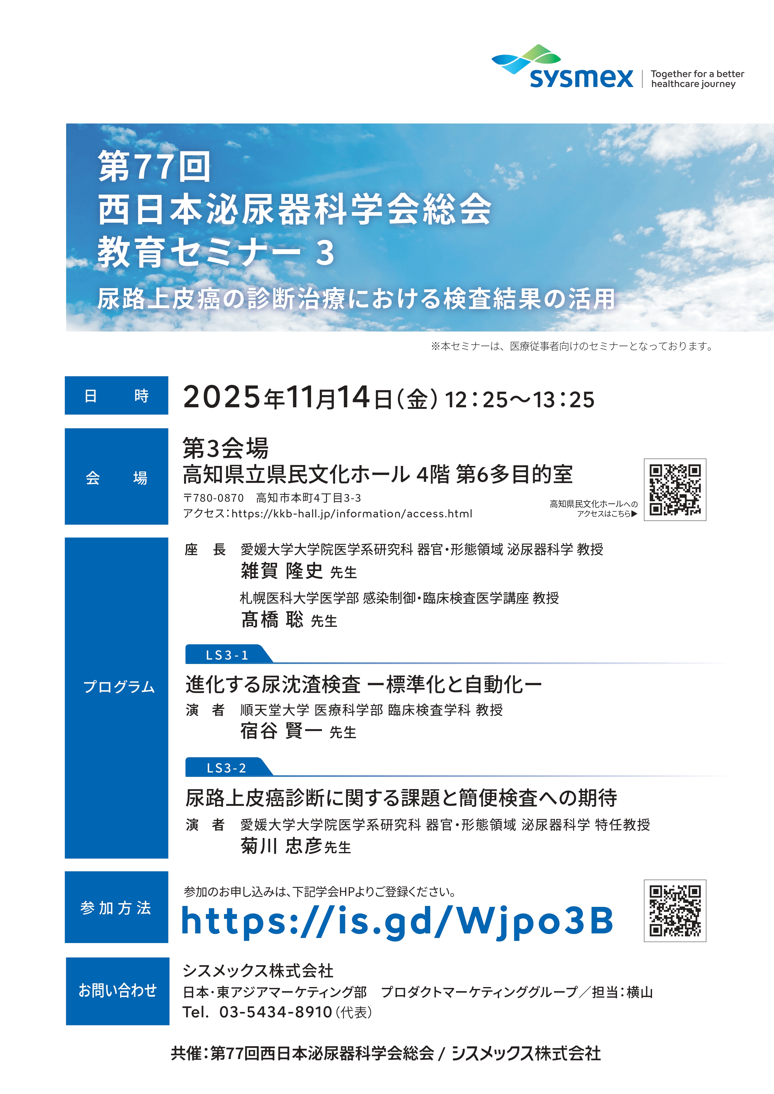 | セミナー名 | 第77回西日本泌尿器科学会総会 教育セミナー3 尿路上皮癌の診断治療における検査結果の活用 |